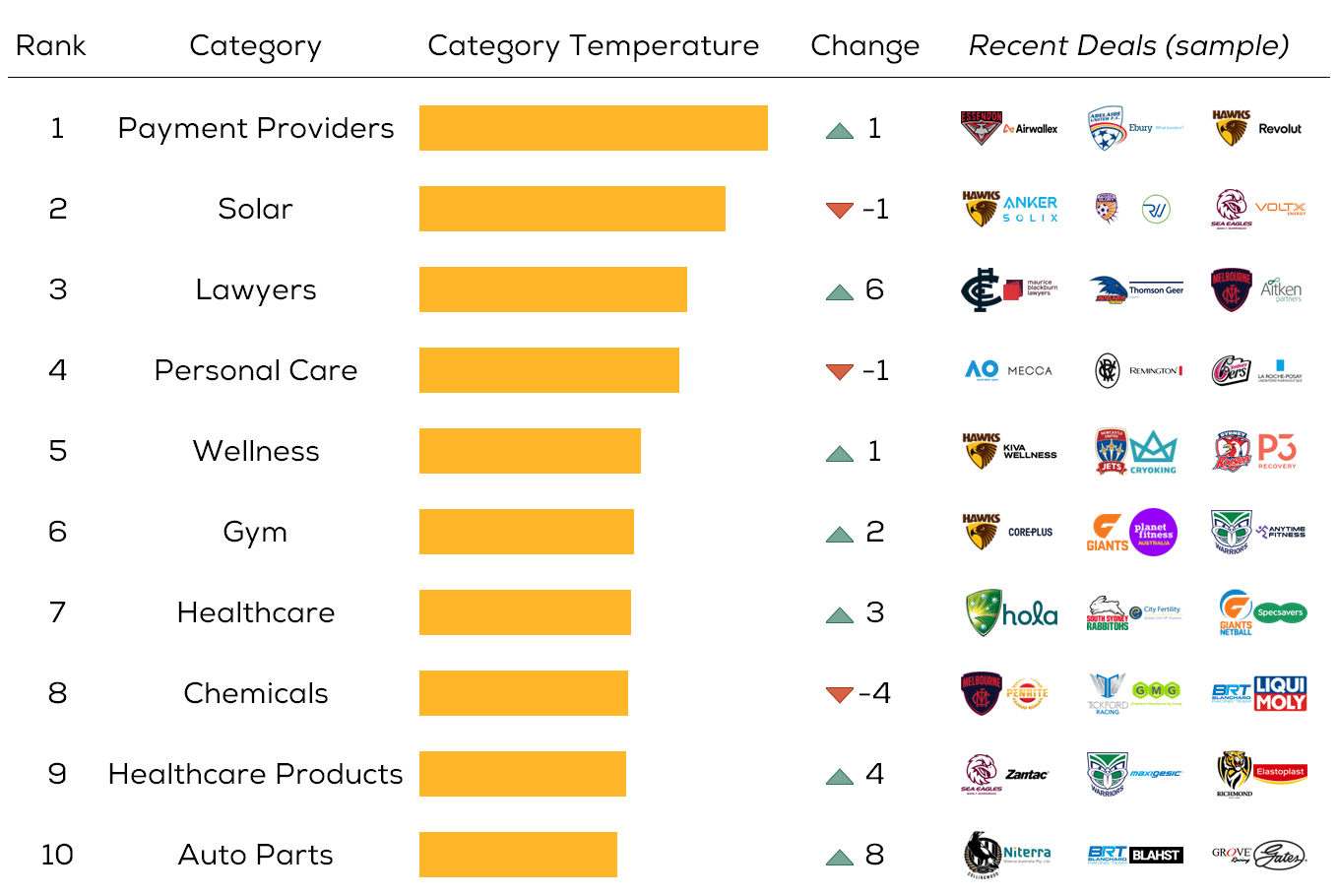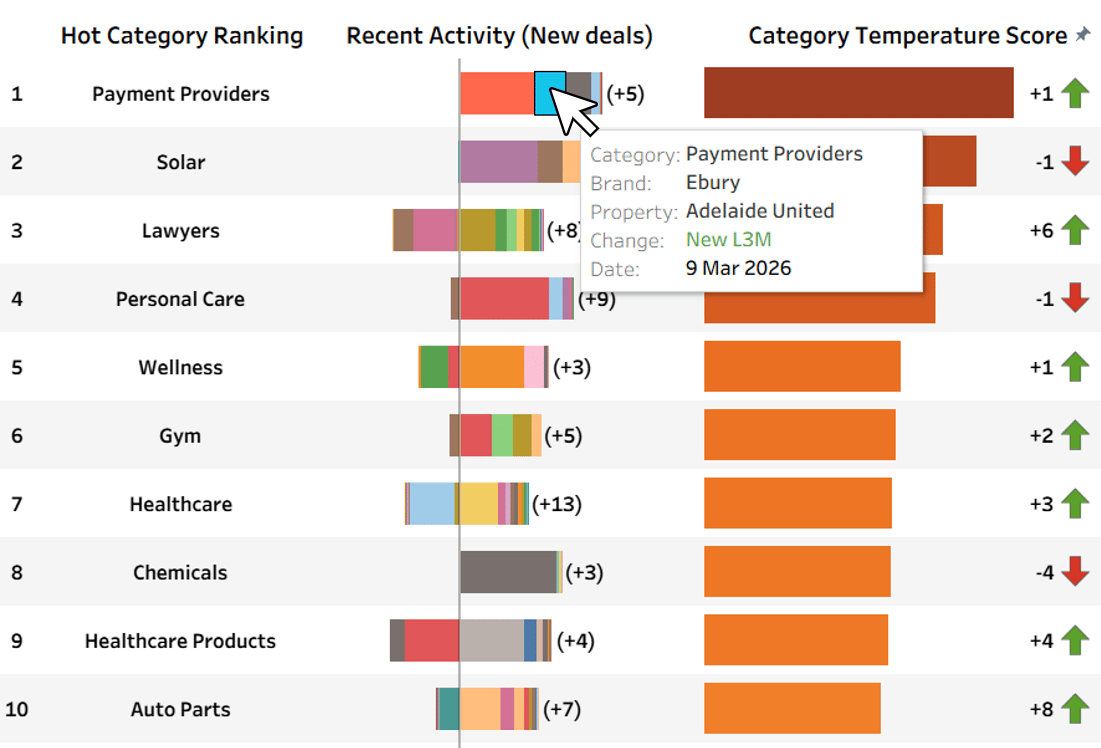 Introducing Hot Categories… Scout’s weekly rank of the sectors most active in sponsorship. Access to the full rankings available in the Scout Pro Dashboard.